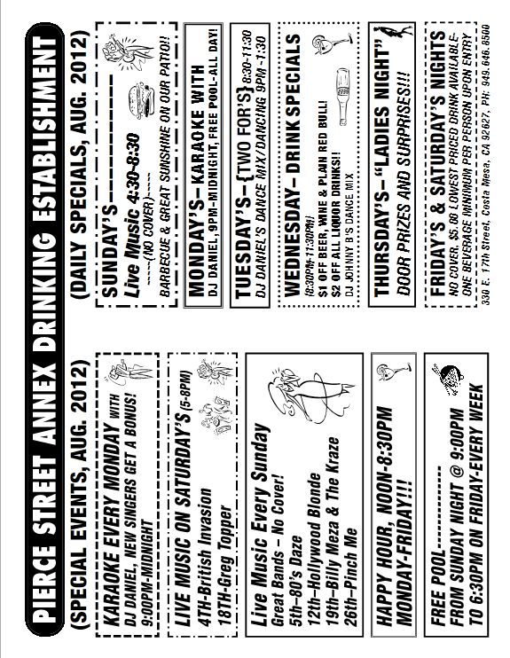 Every month Pierce Street Annex issues a monthly calendar on their website as well as well as flyers that are on the bar surfaces and tables in the bar itself. The flyer promotes all of the monthly specials currently offered. A sample of the August flyer is listed below. There is always a ladies night, a karaoke night, live music night, and several other offers, but most importantly there are always good prices on drinks and never a cover charge with a super positive vibe always!!!