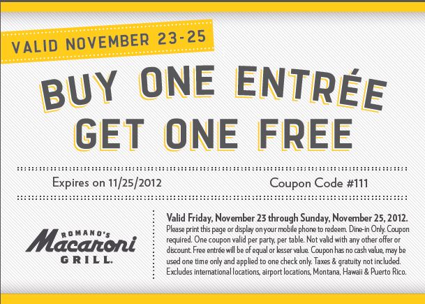 Macaroni Grill -if offering a free entrée with this coupon and it is valid from Friday, November 23 through Sunday, November 25, 2012. Print this coupon or show this ad on mobile phone to redeem. This offer is good for dine-in only.