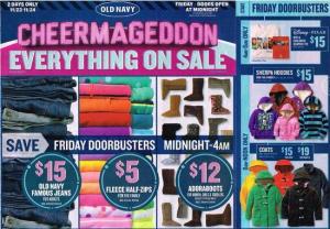 | Adoraboots (Women, Girls, Toddlers)for $12.00 (12am-4am)Fleece Half-Zips for the Family for $5.00 (12am-4am)Old Navy Famous Jeans (Adults) for $15.00 (12am-4am)Disney Pixar DVD & Exclusive Graphic Tee for $15.00 (4am-8am)Coats (Adults) for $19.00 (8am-12pm)