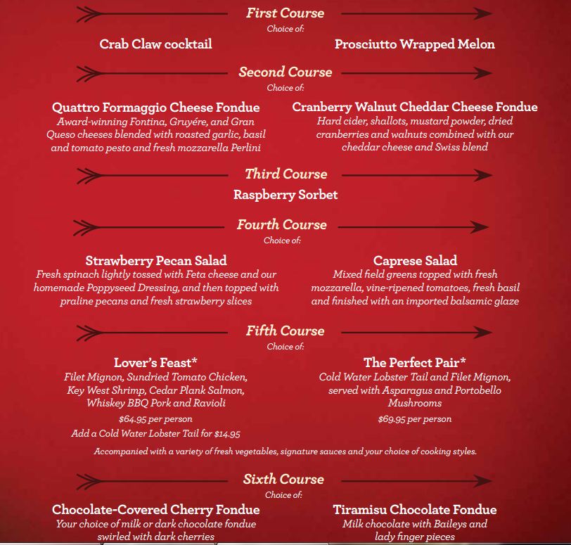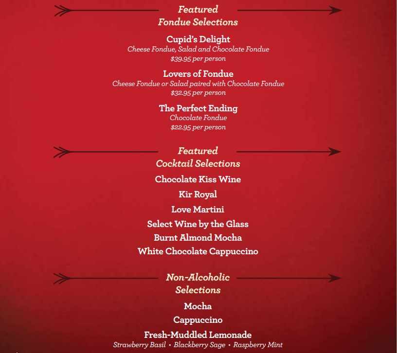 I absolutely love fondue and with these two different options, how can you go wrong? The top menu is for the regular Valentine’s Day menu and the bottom option is also for Valentine’s Day, but it is the late night option. Fondue is a unique experience and if two of your favorite foods are cheese and chocolate..like me…:) This is a great option! Check out my article about the Melting pot from a time I went there and all of the great specials they have : Melting Pot Brea