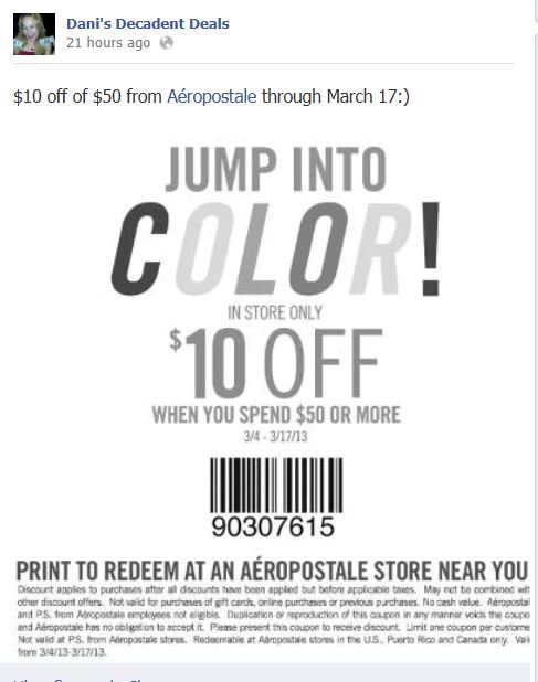 Get $10 off of any $50 purchase at Aeropostale through March 17th!