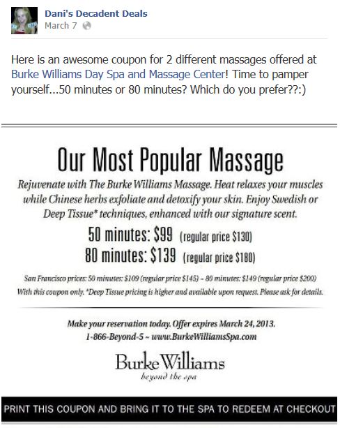 I love a good massage and with this coupon, there are 2 options…50 minute or 80 minute.:) Check it out before March 24!