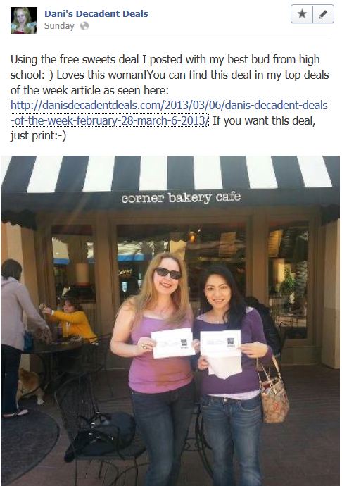 There is still time to get your free Sweet item with any entree purchase. This picture is me and my buddy super happy to redeem our offers for free cream cheese brownies!! Yum!! Go to link here from last weeks deals to print coupon: Corner Bakery Coupon