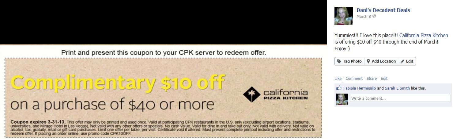 Get $10 off of $40 purchase at California Pizza Kitchen through the end of March!