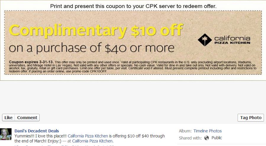 Print this coupon to get $10 off of $40 through the end of March at California Pizza Kitchen!