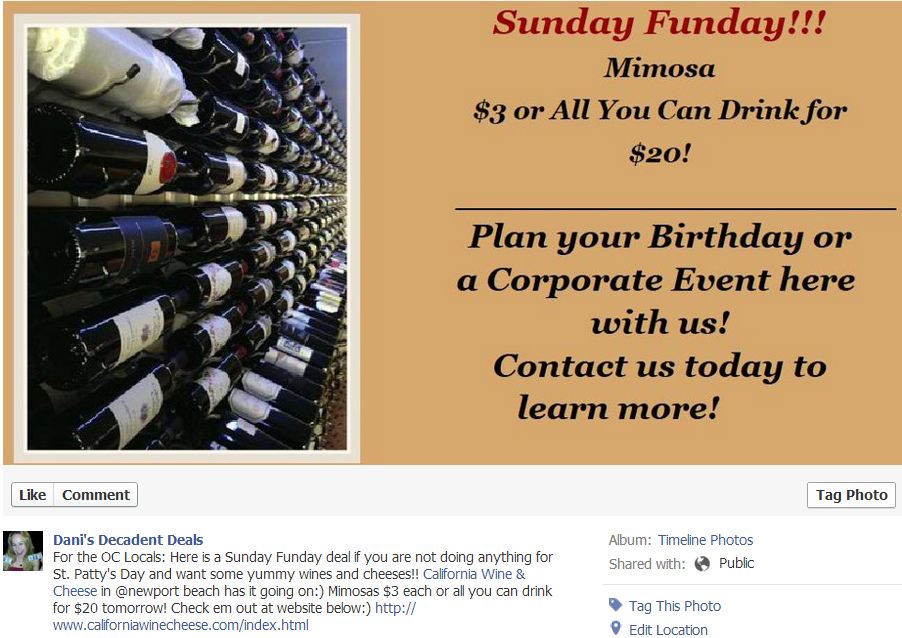 Sundays are sure fundays at California Wine & Chees in Newport Beach where there are $3 Mimosas and $20 all you can drink mimosas.