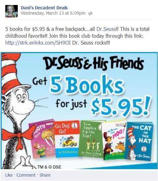 Get 5 Dr. Seuss books & a backpack for $5.95! Join this book club by going to my link on my facebook page here to click on url attached to picture post.