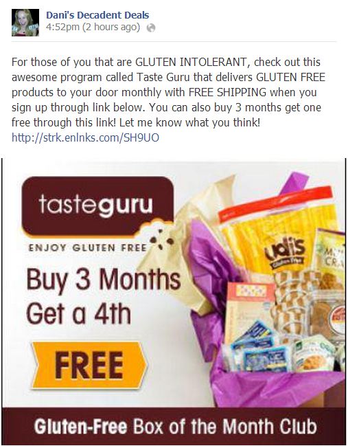 If you are Gluten Intolerant or know someone that is, this could be a great program to check out where they actually deliver gluten free items and recipes to your home free shipping and by going through my link you can pay for 3 months, get one free! Just visit my facebook page here through this link and click on the url attached to the picture post.