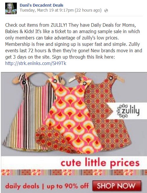 Get awesome clothing for moms, babies, and kids at 90% off. New brands and styles added regularly! Just visit my facebook page here through this link and click on the url attached to the picture post.