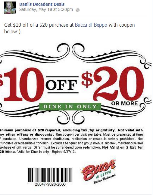 Get $10 off of $20 by printing and using coupon above at Bucca Di Beppo