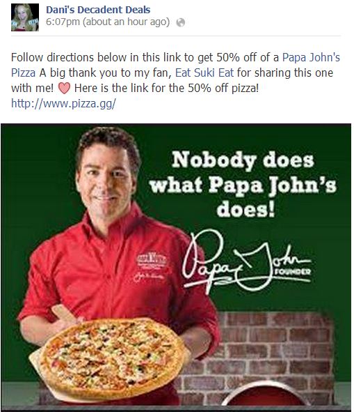 Click on link HERE to get 50% off a Papa John’s Pizza..no expiration listed, so not sure of when this ends..