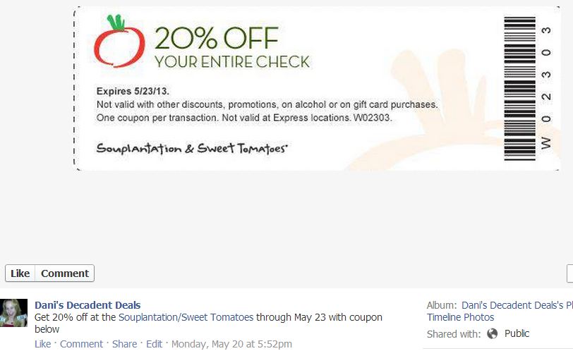 Get 20% off of your bill at Souplantation & Sweet Tomatoes through 5-23-13 by printing out coupon above and bringing in to the restaurant.
