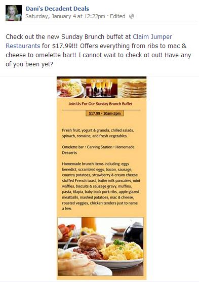 There is a fabulous new brunch started 2 months ago at Claim Jumper for &17.99! Don’t forget to ask about their Landry’s card membership to get special deals when you sign up!