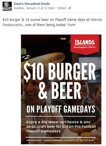 $10 for a burger and a beer on game days at Islands! See game day dates on flyer below!