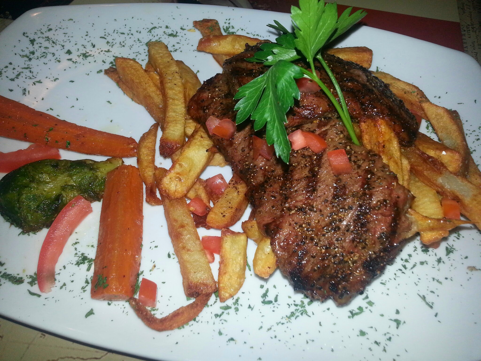 For our main courses we had the Coq au Vin and the Steak Frites.  The Coq au Vin was recommended by our waiter and the owner, Michael himself.  My husband was very happy he selected this dish and enjoyed it very much.  I loved this dish as well, but I was more in a steak mood that evening and my steak frites hit the spot. Normally the steak frites (French fries) comes with a choice of a red demi glaze sauce or a gorgonzola cream cheese sauce, but being the foodie fanatic I am I had to try it both ways, so I asked for both sauces on the side, as well as a side of garlic aioli for my fries.  While I enjoyed them both, my preference for this dish would be the demi glaze sauce. I loved the gorgonzola cream cheese, but it was a bit rich for me and I could not eat the whole steak with that sauce.