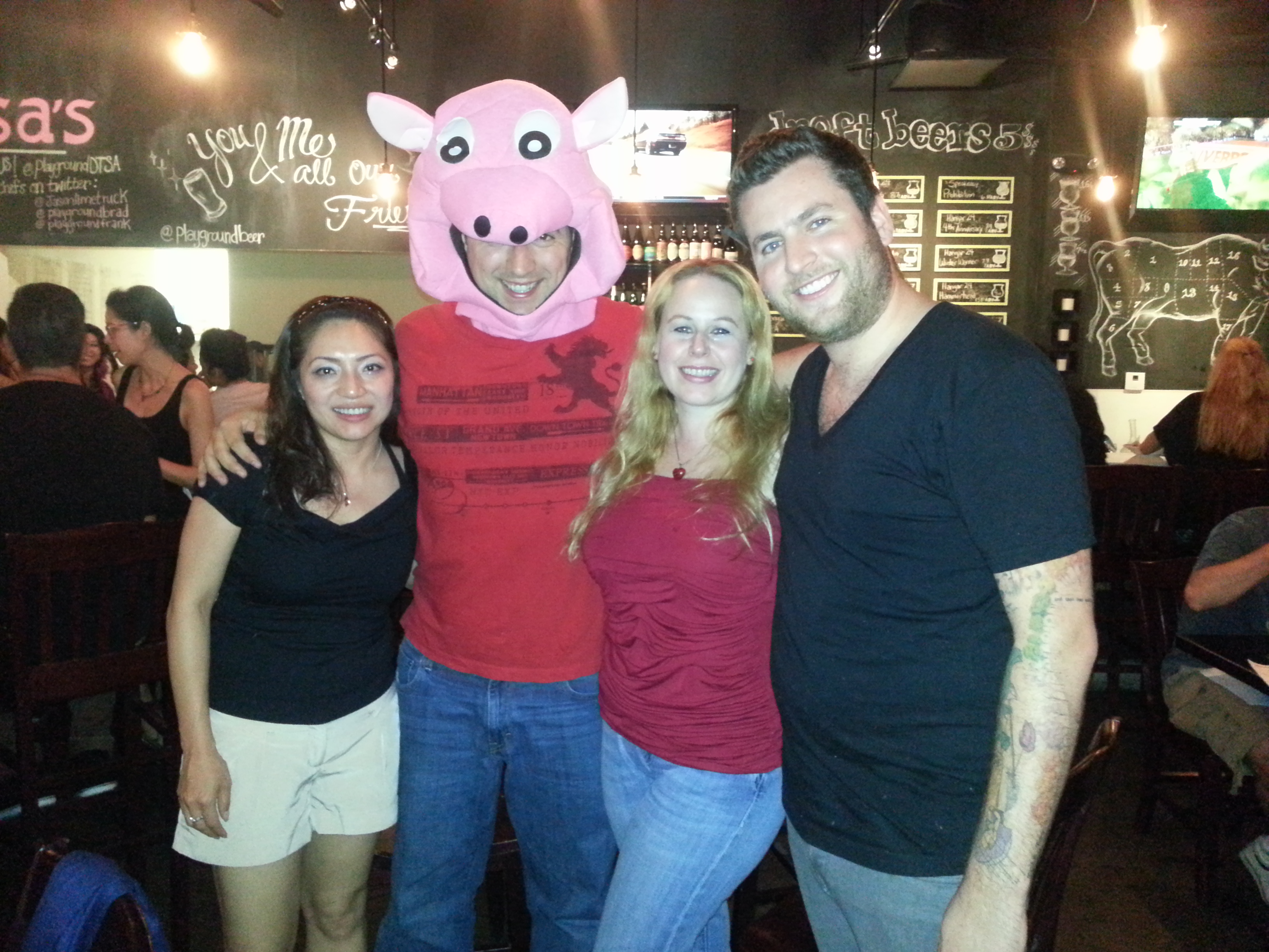Dinner at The Playground, Hubby in a Pig Suit with the Owner and my bestie