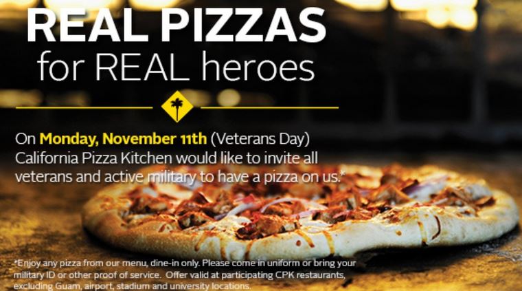 California Pizza Kitchen is offering a complimentary entrée from a special Veterans Day Menu at all participating restaurant in the U.S. to active and retired members of the United States Military on Tuesday.