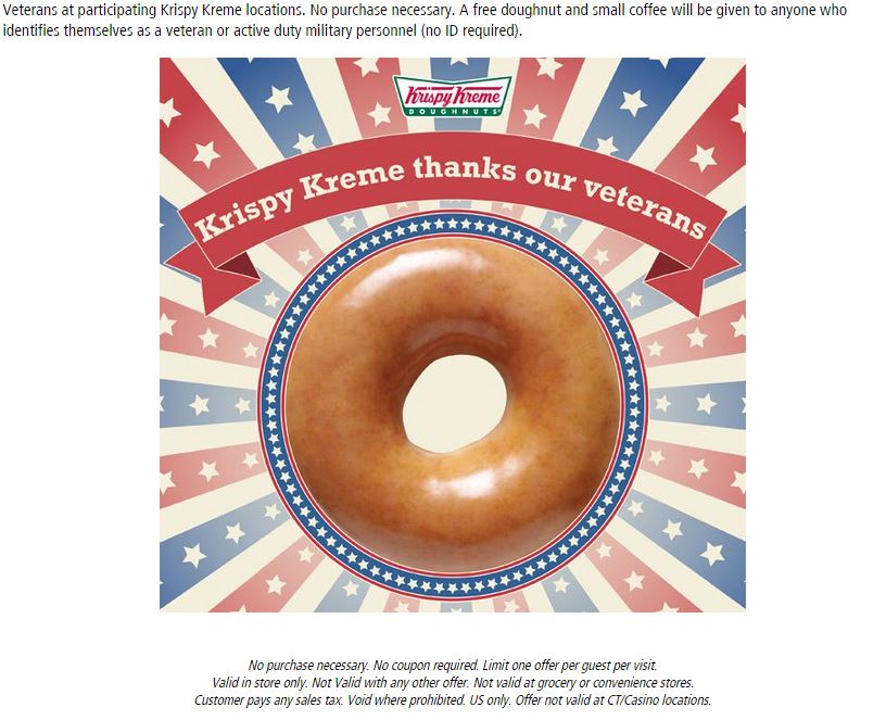 All Veterans can get a free doughnut and small coffee on Tuesday, November 11 at participating locations.
