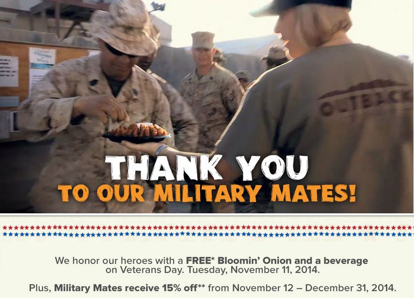 On Tuesday, Outback Steakhouse is honoring all active and retired military personnel with a free Bloomin’ Onion and a beverage. You must show a valid military ID for this deal.