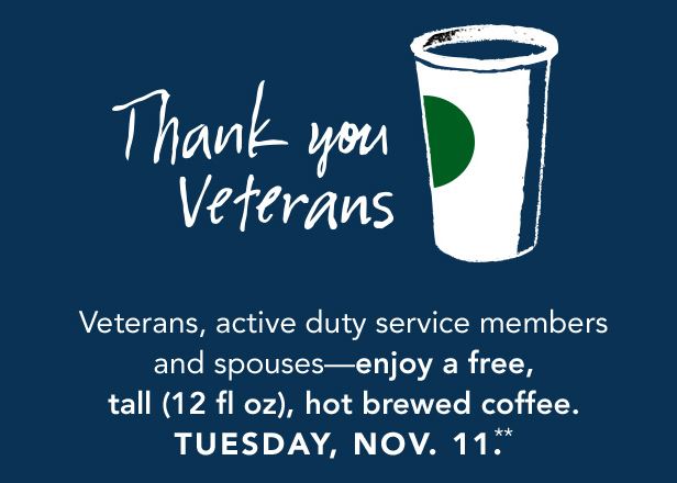 Veterans can get a FREE coffee all day at Starbucks, Tuesday, November 11th. Also, for every Veterans Starbucks Card or eGift purchased through November 11, Starbucks will donate $5 to Onward Veterans*, an initiative to support and empower veterans as they transition to civilian life.