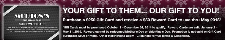 Purchase a $250 gift card and receive a $50 reward card to use through May 2015. The offer is valid until December 24, 2014. Reward Cards can be redeemed from January 2 – May 31. 2015 (Mother’s Day and Valentine’s Day excluded).