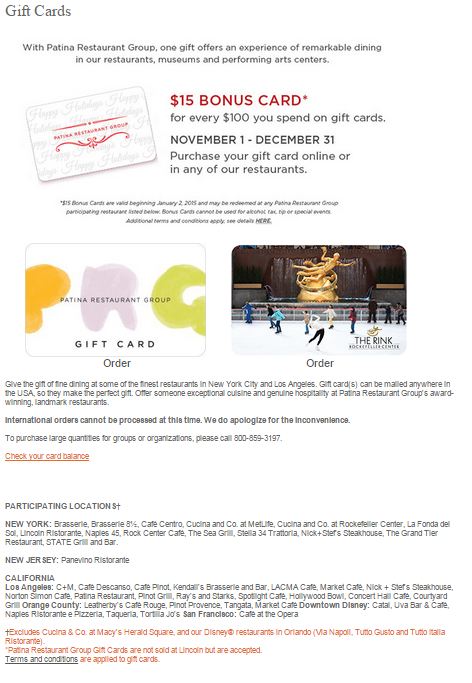 Throughout the month of December get a $15 bonus card for every $100 you spend on gift cards. The bonus cards are valid beginning January 2, 2015 and may be redeemed at any Patina Restaurant Group participating restaurant.