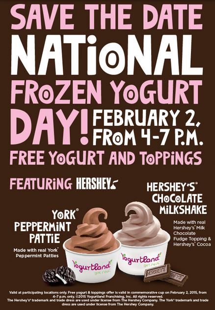 I have noticed that within the last few years there has become a “National Food Day” for almost every food I know! It has really gotten somewhat out of control, but is also a bit funny at the same time. I am here to give mention to one National Food Day that I enjoy yearly and I have seen many others do as well! It is “National Frozen Yogurt Day.” I love National Frozen Yogurt Day because so many different yogurt shoppers offer FREE yogurt on that day or around that day during the same week. I would like to share with you all of the National Yogurt Deals, but as of now they have not all been published, so as I get more information about yogurt shops, I will continue to add them to my post here. 🙂 This year National Frozen Yogurt Day falls on Monday, February 2, 2015.
