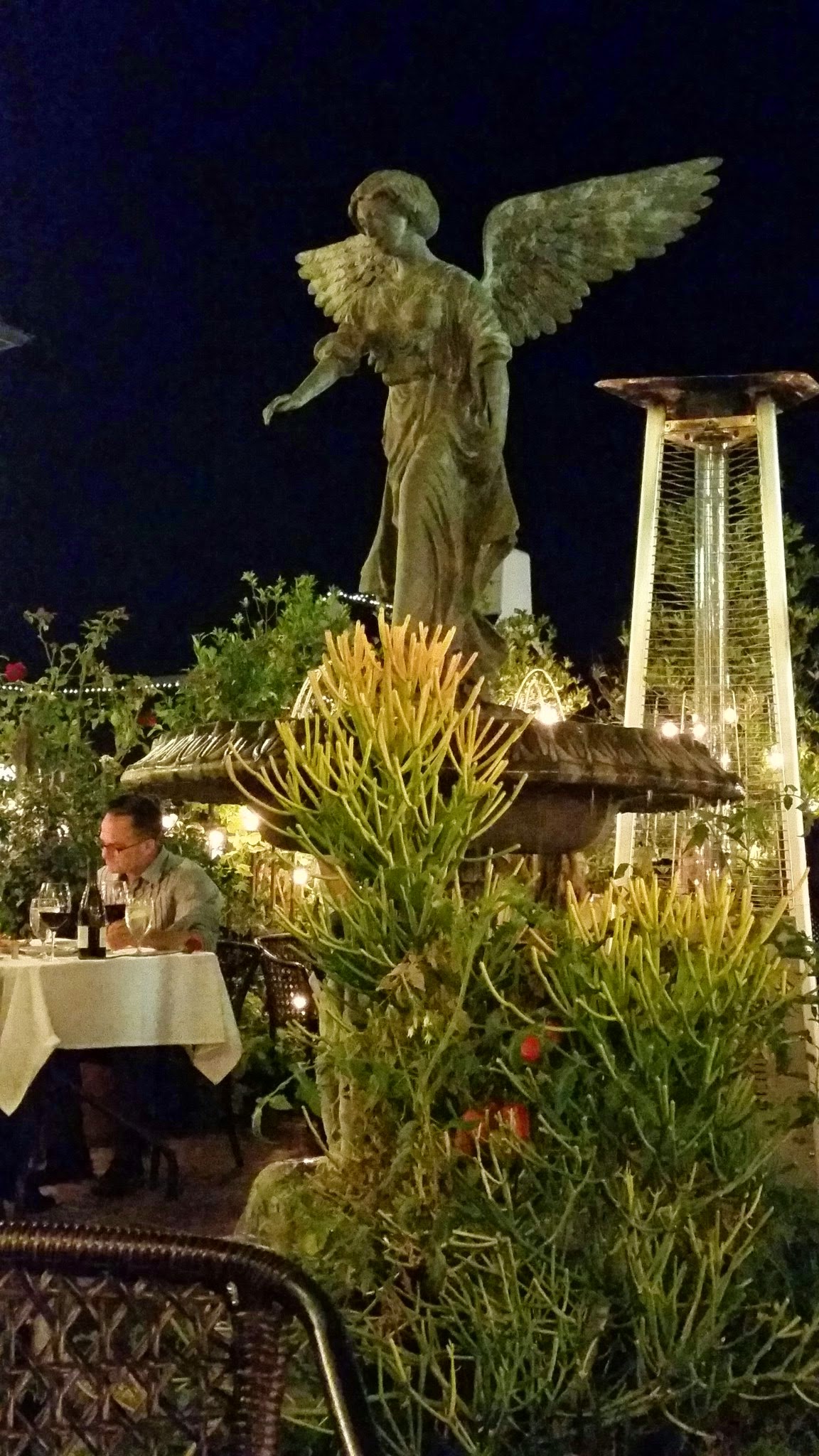 When you enter Christakis you have an option to dine inside where they have lovely live music that is quite mellow to enjoy while you dine or enjoy your glass of wine. There is also an outdoor patio area with an adorable fountain in which there is an angel with wings reaching out. It is definitely a unique setup with strings of lights and many heating lamps, so it is never cold outside. I actually even sit there in the wintertime. 🙂