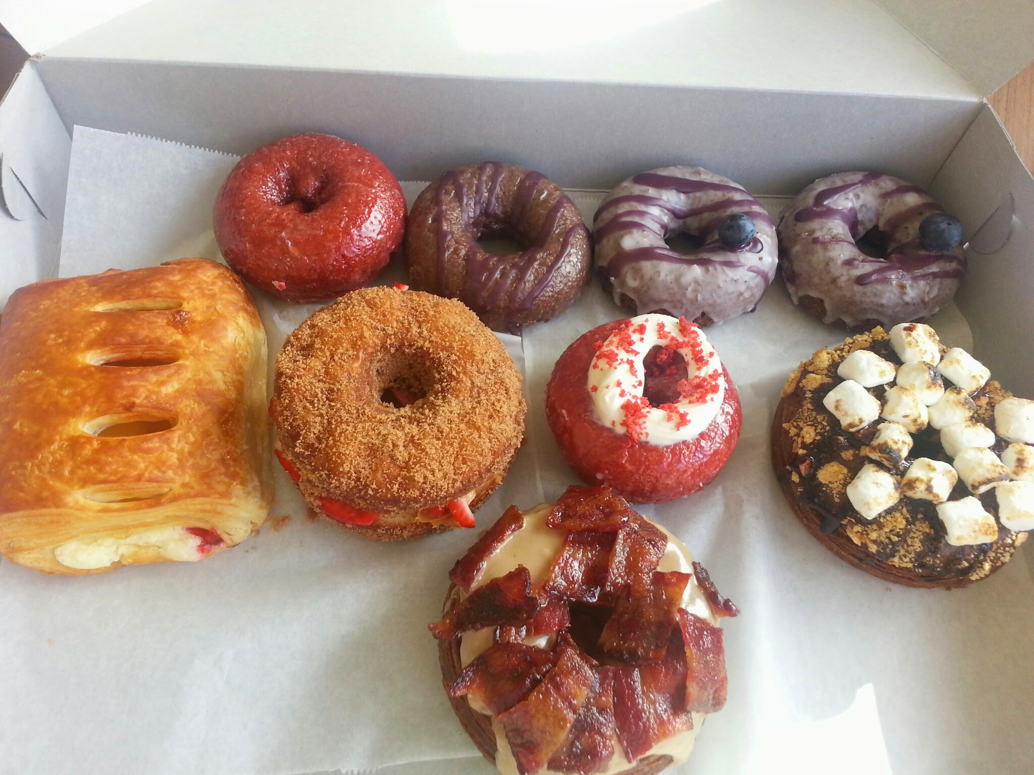 On my first visit to Friendly, my friend, Jennifer and I went crazy and each bought a huge box of a variety of doughnuts and tried all of them and of course took home the remains to feed to our spouses. 🙂 In this first batch I tried maple bacon, ube plain, blueberry, red velvet plain, red velvet with frosting, strawberry cream cheese croissant, strawberry and cream filled cronut sandwich, and smore’s cronut. My most favorite treat from this group was the maple bacon doughnut! This doughnut was jam packed full of flavor and the blend of the sweet and salty had my taste buds aroused! All of these doughnuts were pure perfection in their moist and gooey goodness!