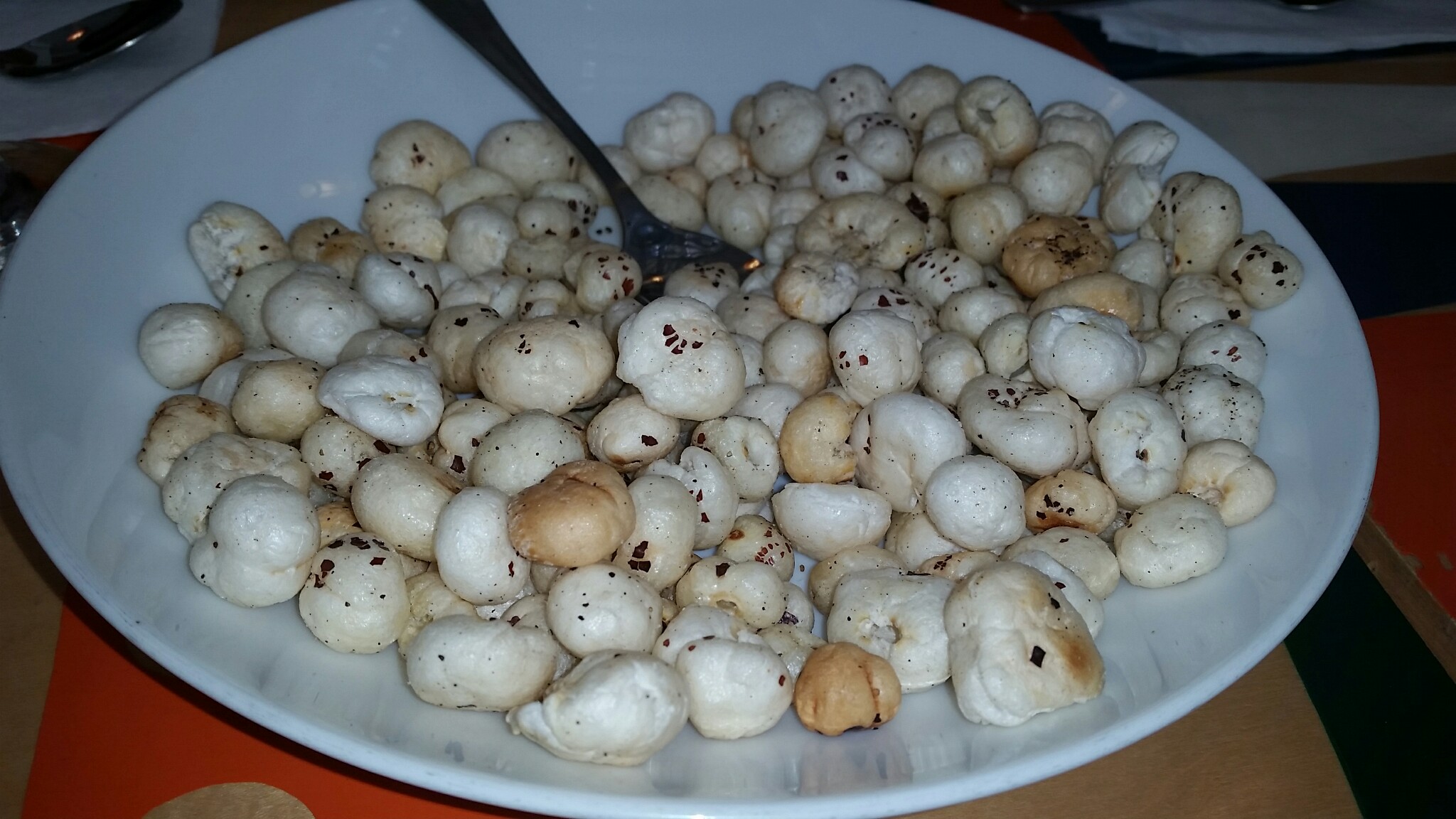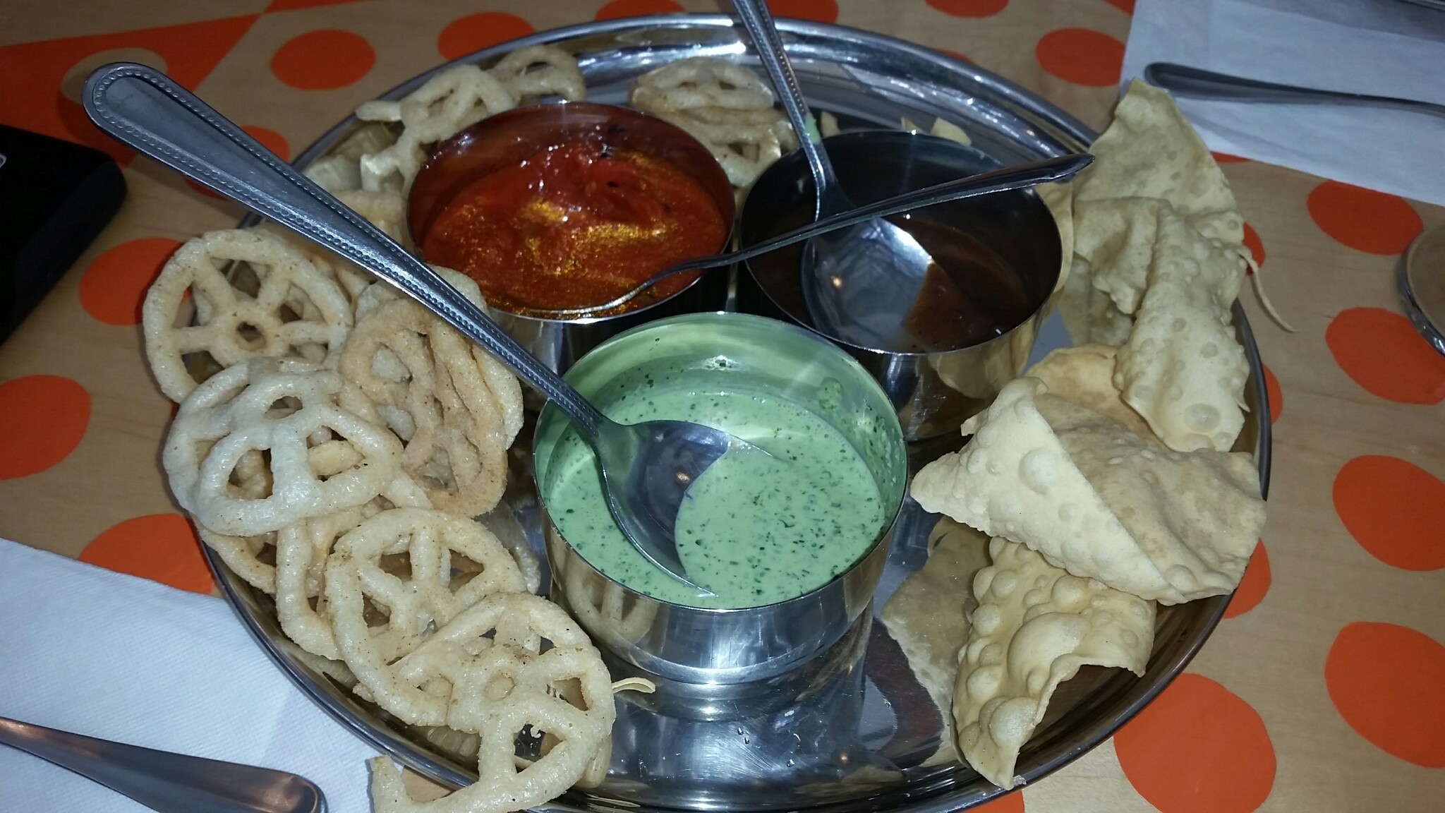 We started our evening with Papadum, which is a crisp fresh prepared type of cracker or flatbread with tomato chutney, mint chutney, and tamarind chutney as dipping sauces, along with a platter of puffed lotus seeds. Each of the flavors was unique and tasty, but my personal favorite was the mint chutney that was blended with a yogurt and ginger. It was flavorful and addicting. 🙂