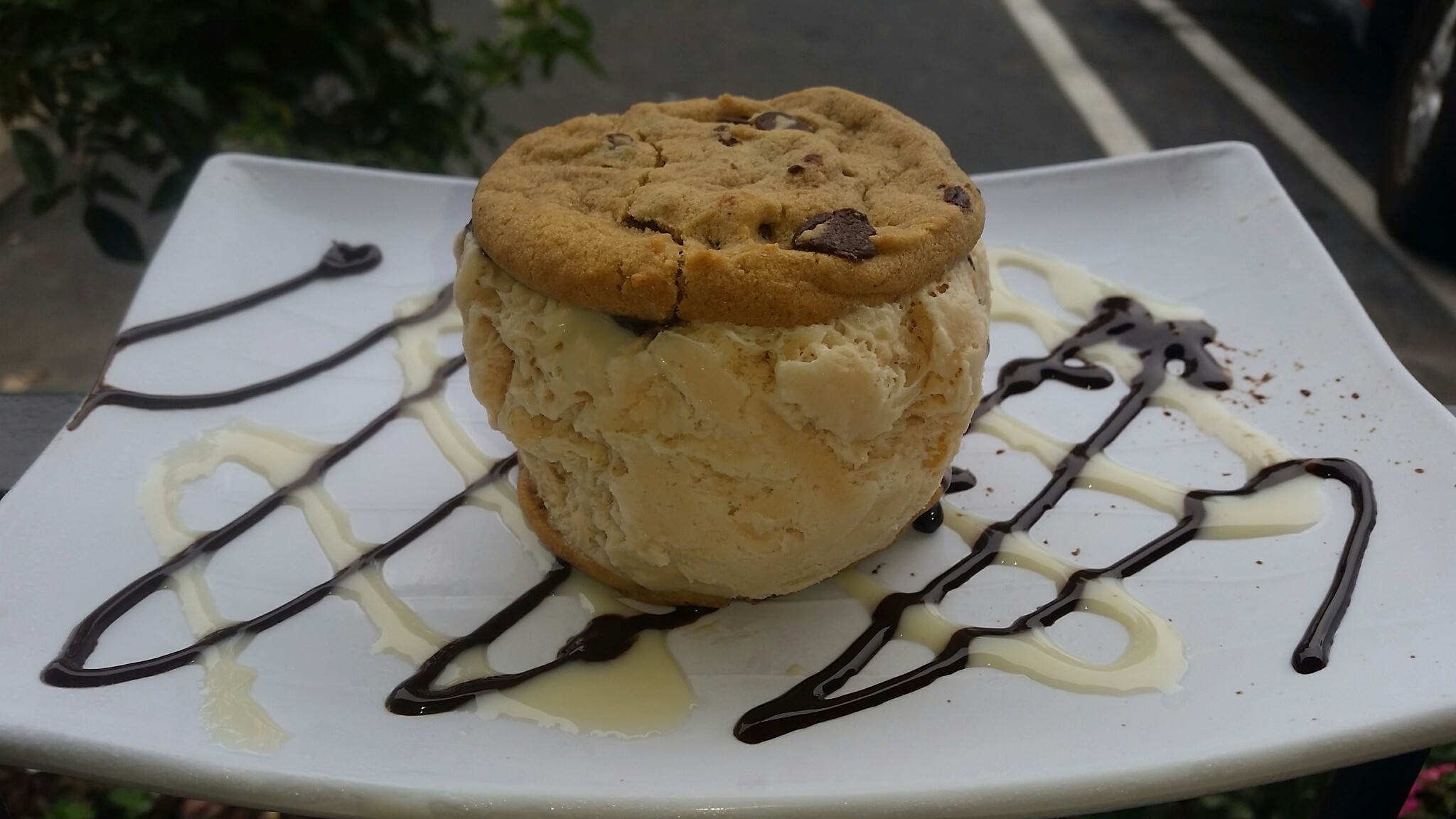 My husband’s selection was the Snookie which was a cookie sandwich with fresh snow pressed in-between. 🙂 My hubby happily chose Horchata snow and some flavored syrups slathered between two chocolate chip cookies! It was so very tasty and we were both very happy with our selections!