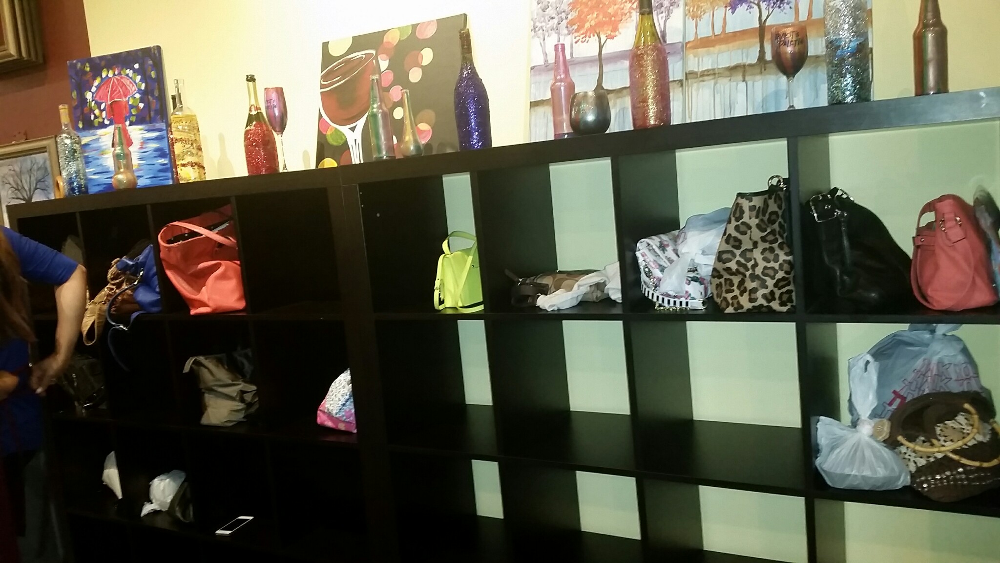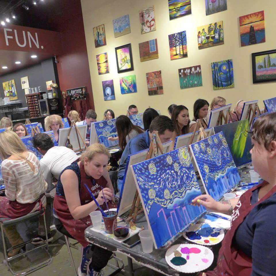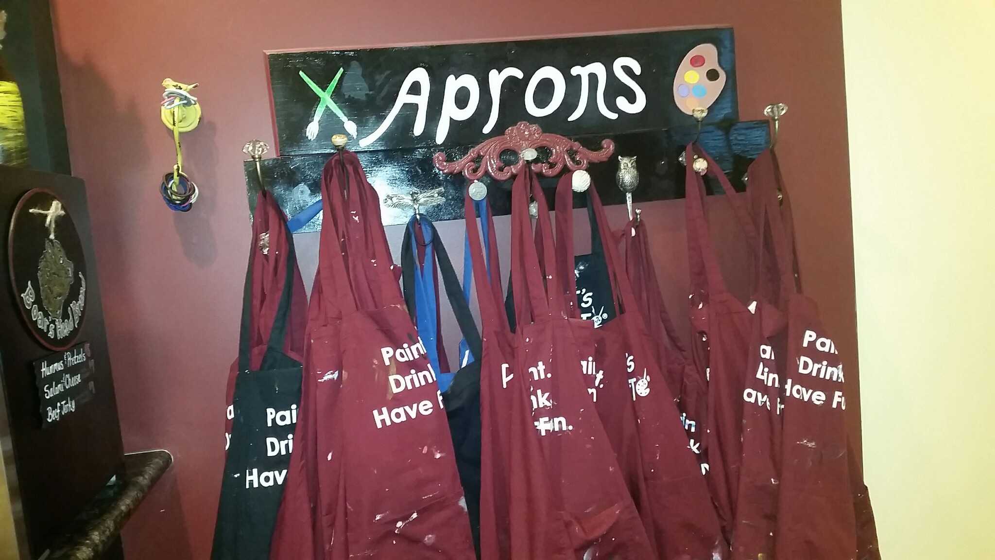 When we arrived at Pinot’s Palette we were warmly greeted by our instructor, Debra at the front door! She had a huge smile and was super friendly as she showed us around the large room and took photos of us with silly masks and paintings.:) We made our way over to our seats that were in a great location that I had selected when I reserved the class (great tip…try to ask for a seating area….I personally loved being front and center.)) After checking out our seats, we put our belongings in a cubby hole like I remember doing in Kindergarten and wandered over to get an adjustable apron so we could be in style for the occasion and not damage our clothing with paint…or wine. 🙂