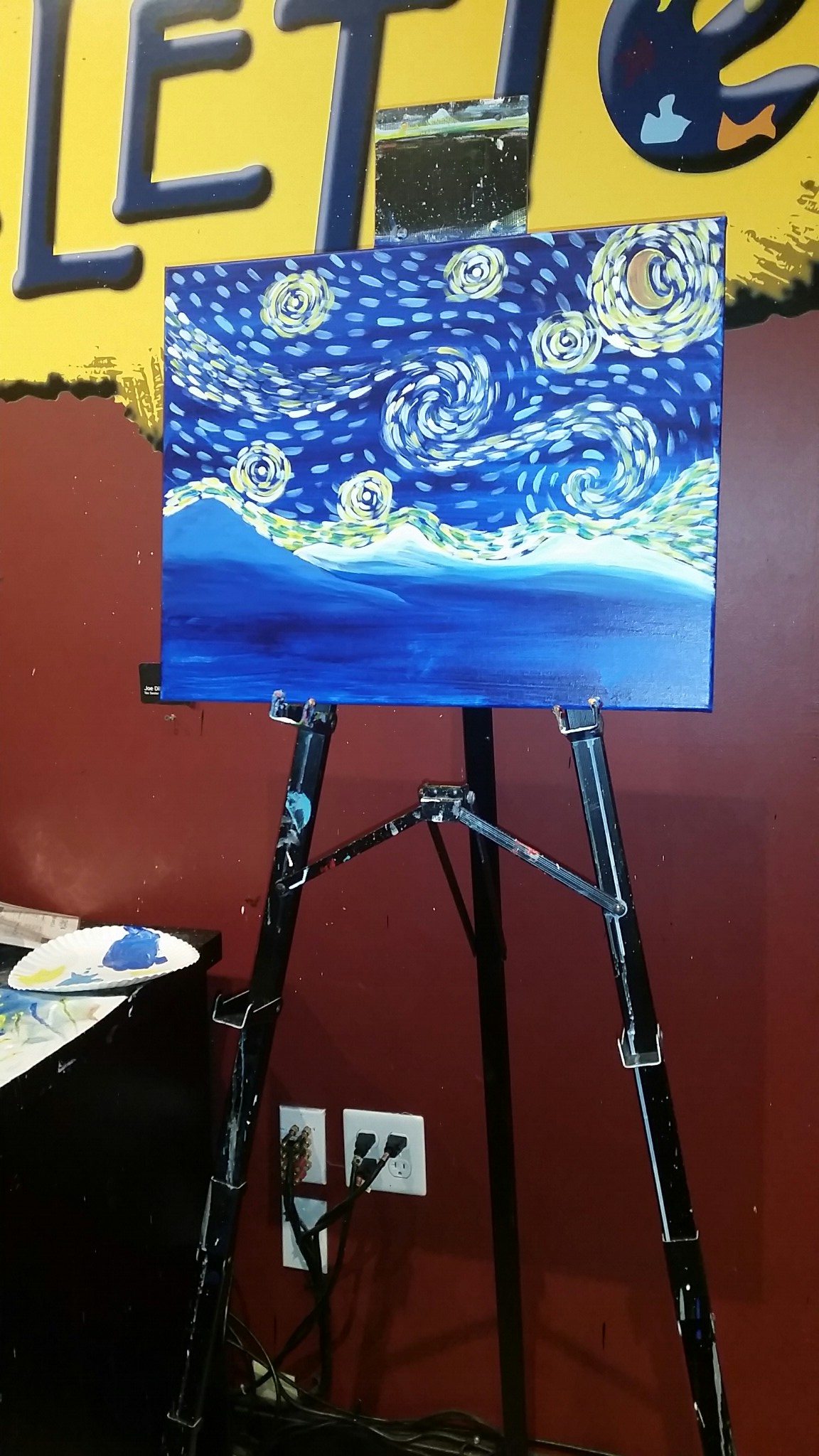 I loved our instructor, Debra. She made everyone feel welcome and at home for the entire evening and was very good about running out to help people if they got stuck. At one point when I was painting one of my swirls in the sky, I did not like the way it came out and she came over quickly to help me fix my paint and start over on the small area!